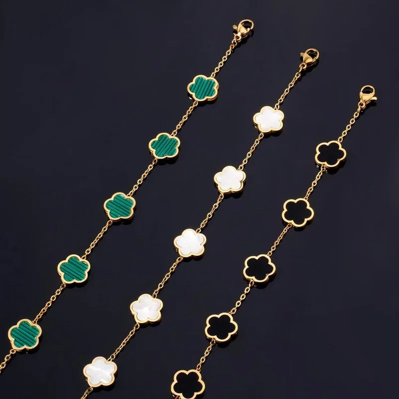 Waterproof, scratch-resistant, and made from premium stainless steel, the Noir Fleur bracelet blends everyday wearability with quiet elegance. Featuring clover-shaped charms and a refined gold-tone chain, it's built to shine without fading—rain or shine.