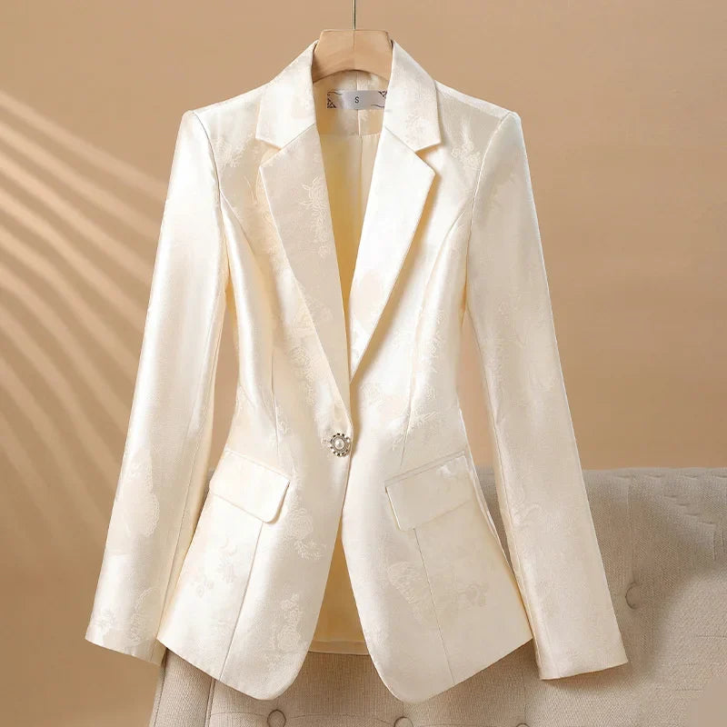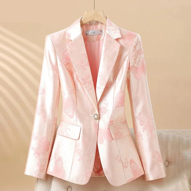 The Rosette Blazer isn’t just a jacket—it’s a statement. Cotton-touch finish, embossed butterfly jacquard, and a jeweled button that catches the light like a crown. Designed to shape the waist and flatter every move, this piece brings romance, power, and polish into one unforgettable silhouette. For the woman who walks in soft, but leaves a mark.