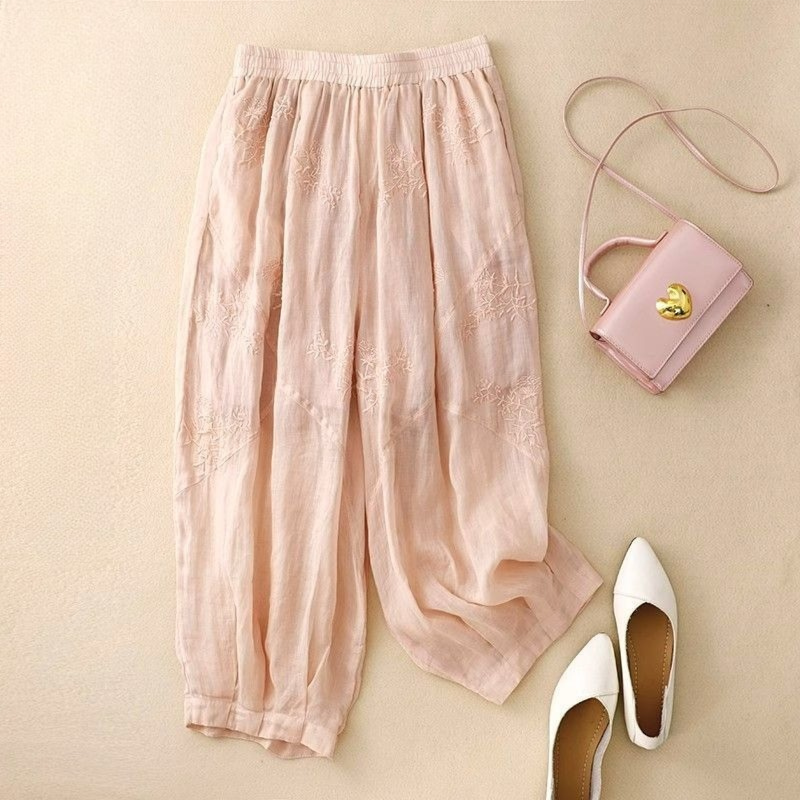 Crafted from our signature cotton-linen blend, these embroidered trousers are made to breathe. The wide, relaxed fit floats with every step, while tonal stitching adds a delicate touch. Finished with an easy waistband and gathered hems—this piece was made for slow days and warm skies.